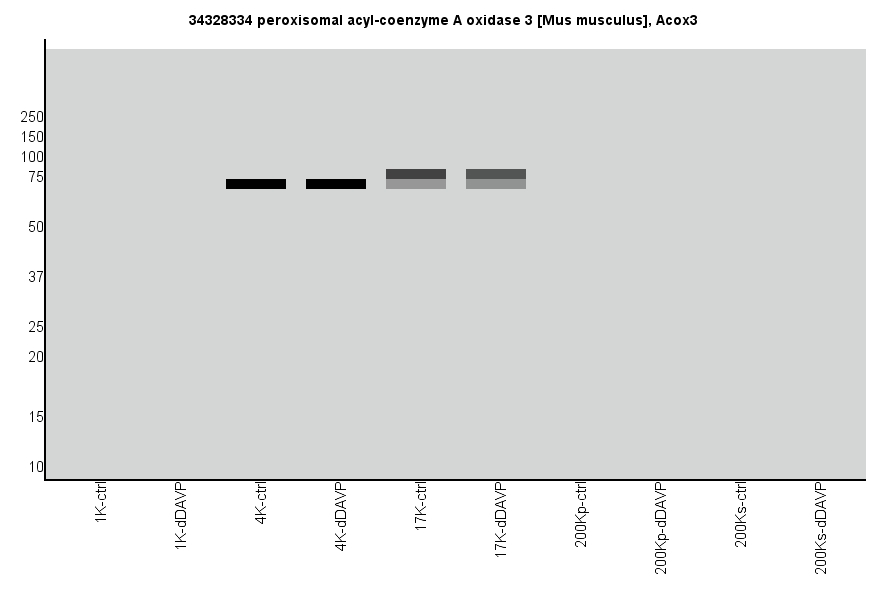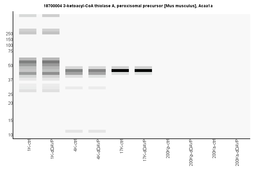 | 18700004 | Acaa1a | 41242 | 1.30 | 1.30 | 0.99 | 0.99 | 0.99 | 0.99 | 3-ketoacyl-CoA thiolase A, peroxisomal precursor | |||||||||||