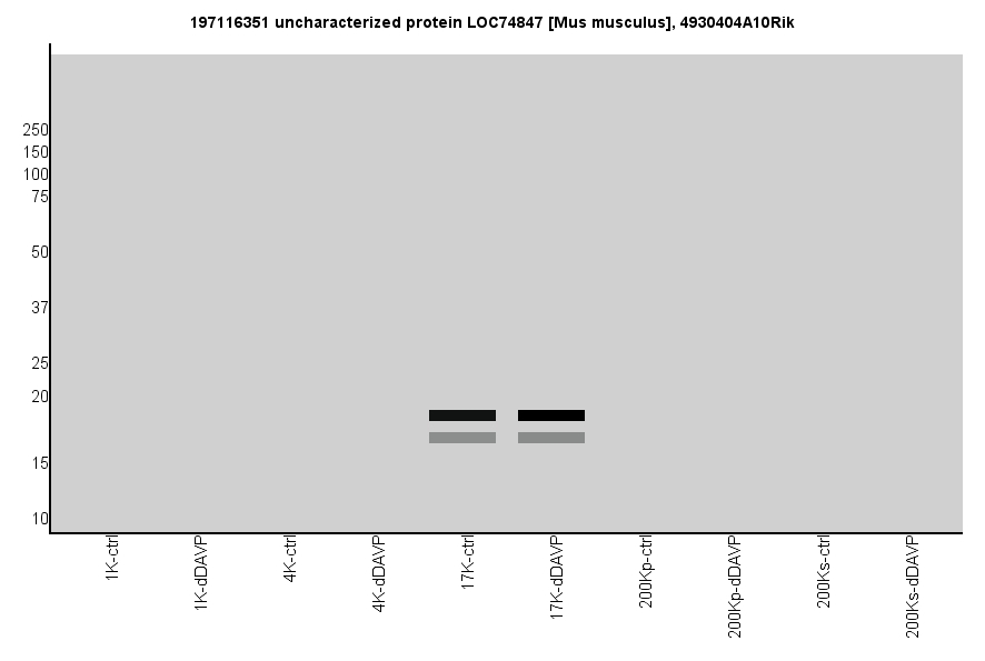 | 197116351 | 4930404A10Rik | 47292 | 0.37 | 0.37 | uncharacterized protein LOC74847 | |||||||||||||||