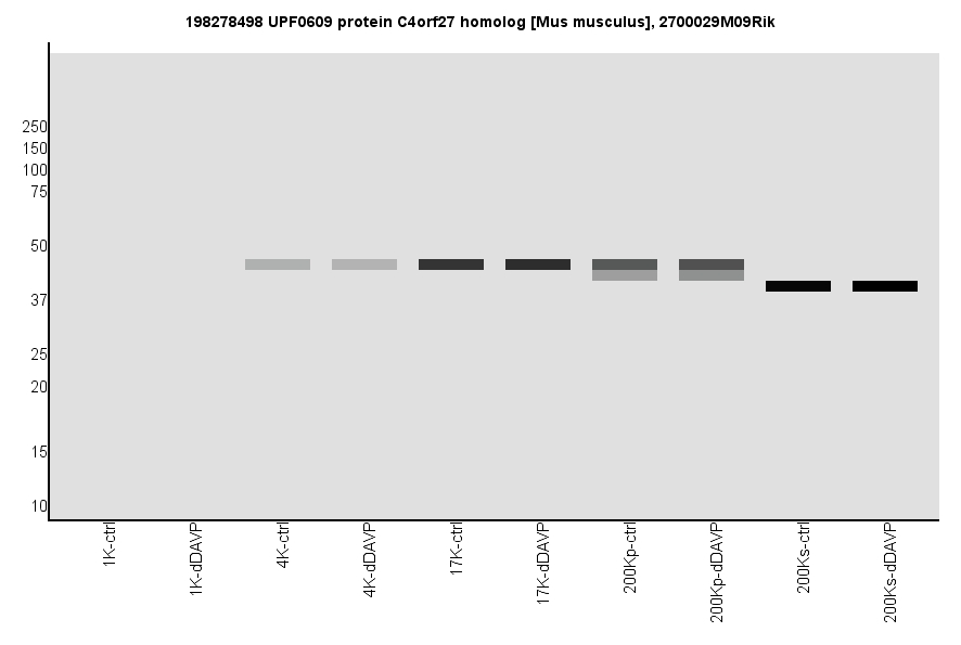 | 198278498 | 2700029M09Rik | 39160 | 1.04 | 1.04 | 1.04 | 1.04 | 1.04 | 1.04 | 0.89 | 0.89 | UPF0609 protein C4orf27 homolog | |||||||||