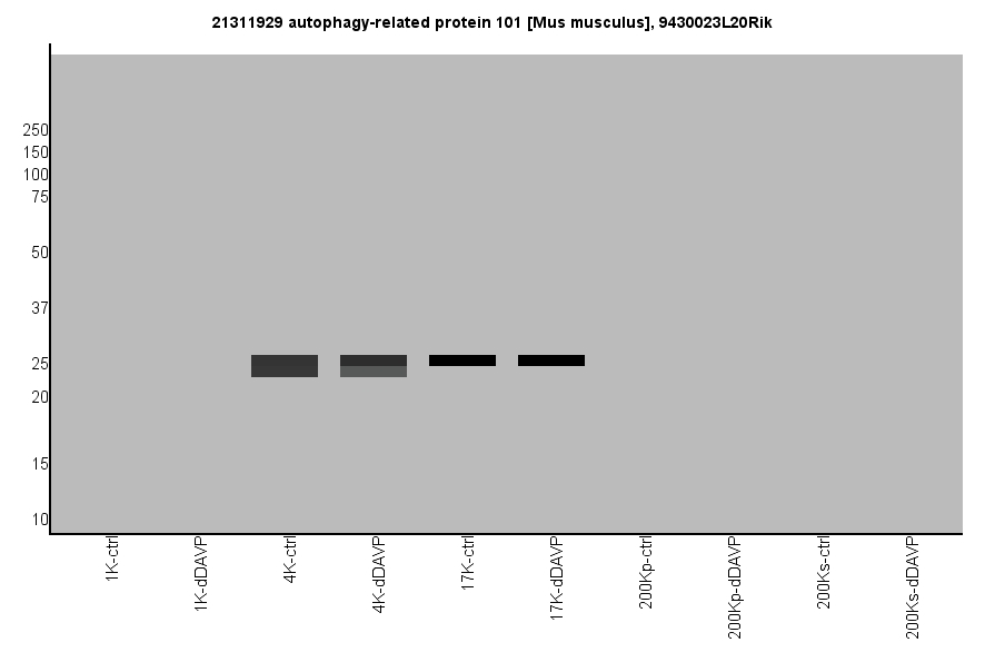 | 21311929 | 9430023L20Rik | 24871 | 0.92 | 0.92 | 0.92 | 0.92 | autophagy-related protein 101 | |||||||||||||