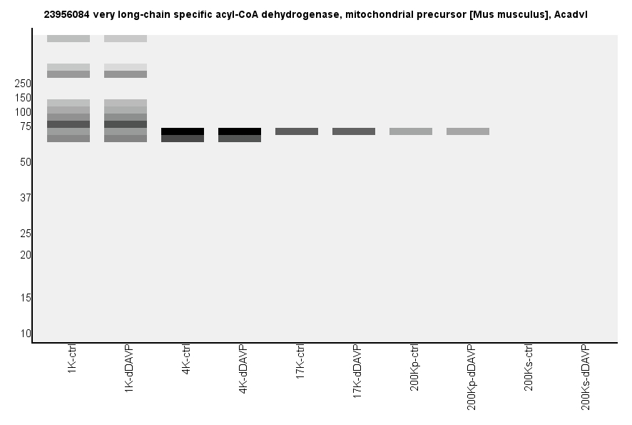 | 23956084 | Acadvl | 66338 | 1.26 | 1.26 | 1.11 | 1.11 | 1.11 | 1.11 | 1.11 | 1.11 | very long-chain specific acyl-CoA dehydrogenase, mitochondrial precursor | |||||||||