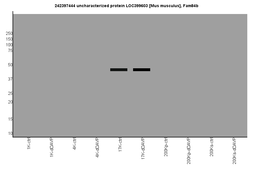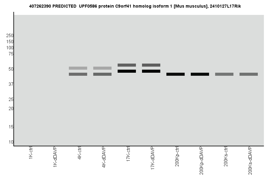 | 407262392 | 2410127L17Rik | 41356 | 1.08 | 1.08 | 0.99 | 0.99 | 0.99 | 0.99 | UPF0586 protein C9orf41 homolog isoform 2 | |||||||||||