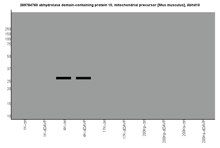 | 269784760 | Abhd10 | 28180 | 0.88 | 0.88 | abhydrolase domain-containing protein 10, mitochondrial precursor | |||||||||||||||