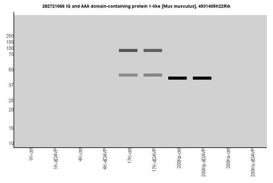 | 282721066 | 4931409K22Rik | 95825 | 0.99 | 0.99 | 0.39 | 0.39 | IQ and AAA domain-containing protein 1-like | |||||||||||||