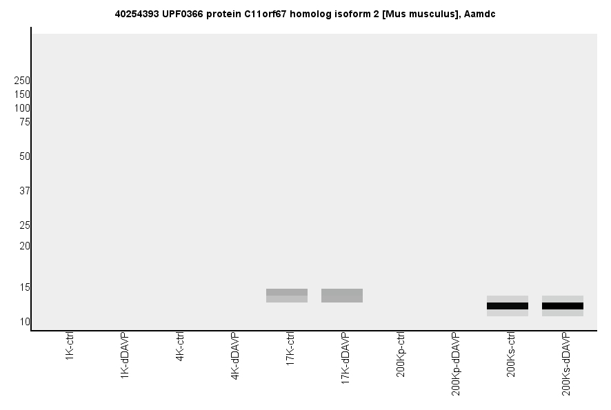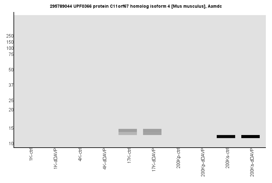 | 295789044 | Aamdc | 9799 | 1.39 | 1.39 | 1.27 | 1.27 | UPF0366 protein C11orf67 homolog isoform 4 | |||||||||||||