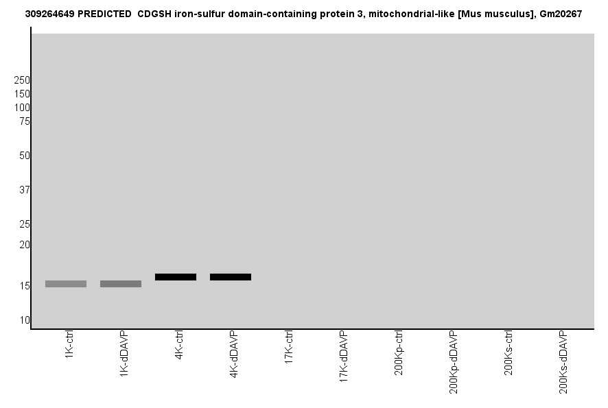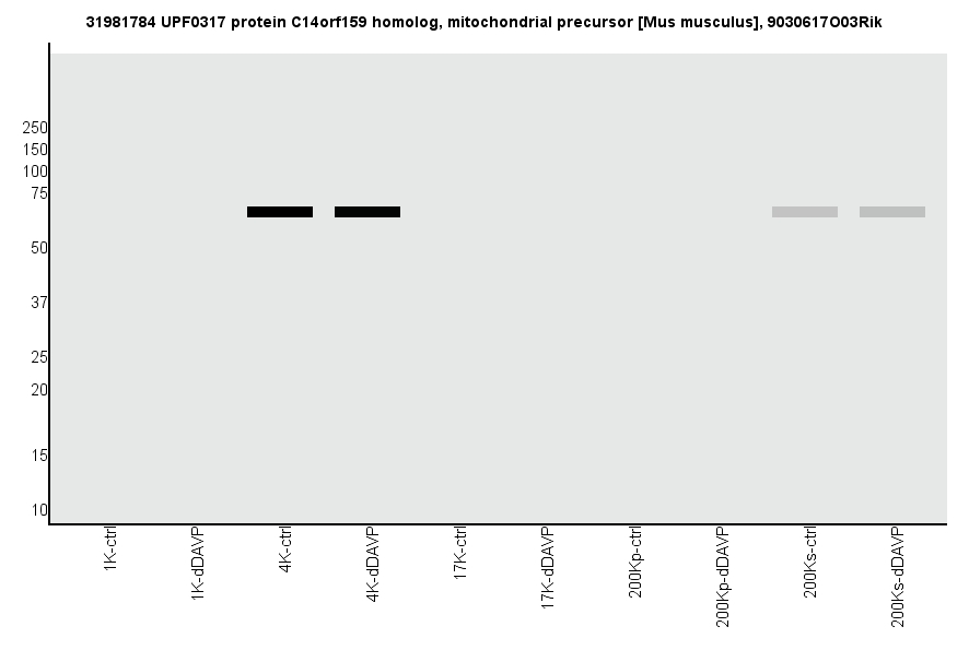 | 31981784 | 9030617O03Rik | 63467 | 1.04 | 1.04 | 1.04 | 1.04 | UPF0317 protein C14orf159 homolog, mitochondrial precursor | |||||||||||||
