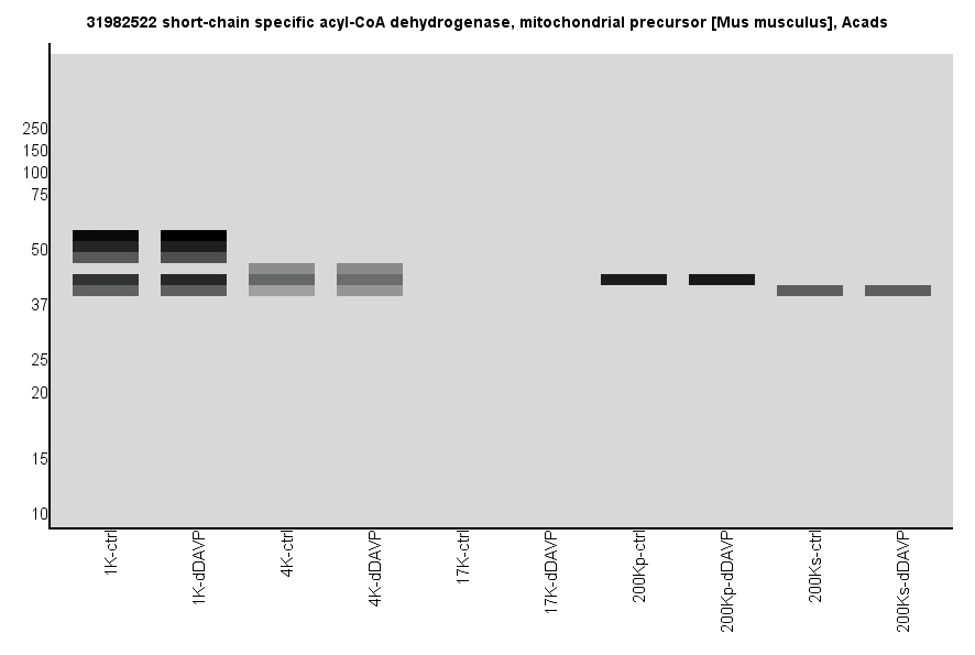 | 31982522 | Acads | 42175 | 1.26 | 1.26 | 0.89 | 0.89 | 0.89 | 0.89 | 0.82 | 0.82 | short-chain specific acyl-CoA dehydrogenase, mitochondrial precursor | |||||||||