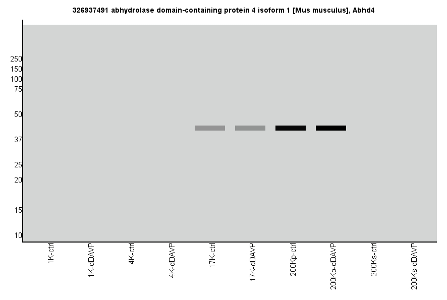 | 326937494 | Abhd4 | 35917 | 1.04 | 1.04 | 1.04 | 1.04 | abhydrolase domain-containing protein 4 isoform 2 | |||||||||||||