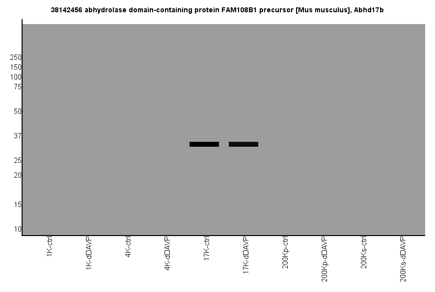 | 38142456 | Abhd17b | 29799 | 0.93 | 0.93 | abhydrolase domain-containing protein FAM108B1 precursor | |||||||||||||||