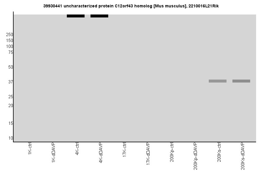 | 39930441 | 2210016L21Rik | 27472 | 221.97 | 221.97 | 1.19 | 1.19 | uncharacterized protein C12orf43 homolog | |||||||||||||