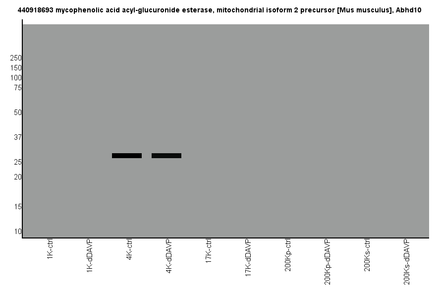 | 440918693 | Abhd10 | 27255 | 0.91 | 0.91 | mycophenolic acid acyl-glucuronide esterase, mitochondrial isoform 2 precursor | |||||||||||||||