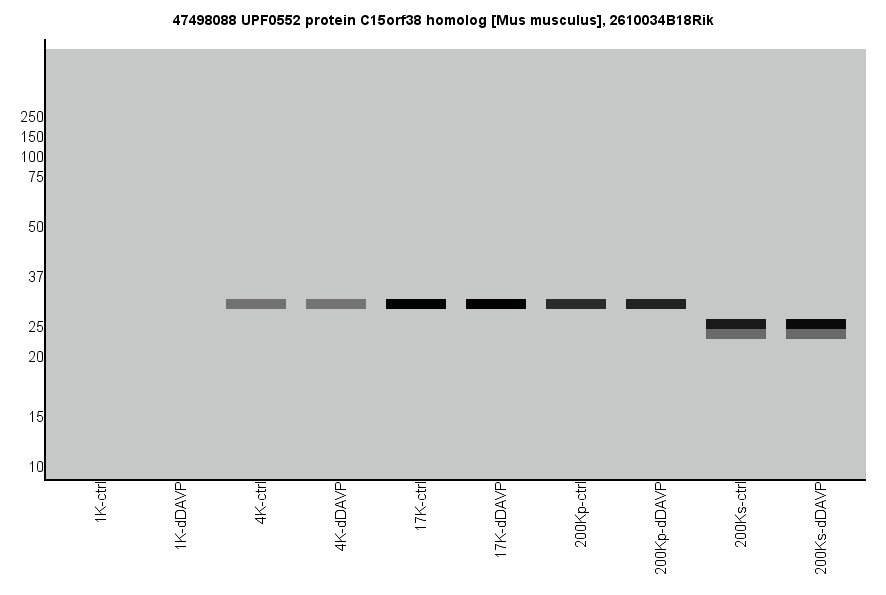 | 47498088 | 2610034B18Rik | 25062 | 1.05 | 1.05 | 1.05 | 1.05 | 1.05 | 1.05 | 0.92 | 0.92 | UPF0552 protein C15orf38 homolog | |||||||||
