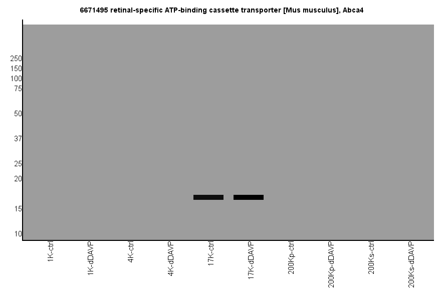 | 6671495 | Abca4 | 260080 | 0.06 | 0.06 | retinal-specific ATP-binding cassette transporter | |||||||||||||||