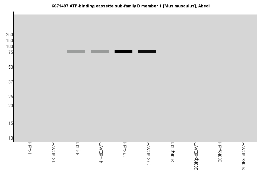 | 6671497 | Abcd1 | 81728 | 1.01 | 1.01 | 1.01 | 1.01 | ATP-binding cassette sub-family D member 1 | |||||||||||||