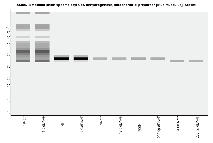 | 6680618 | Acadm | 43593 | 1.21 | 1.21 | 0.92 | 0.92 | 0.92 | 0.92 | 0.92 | 0.92 | 0.85 | 0.85 | medium-chain specific acyl-CoA dehydrogenase, mitochondrial precursor | |||||||