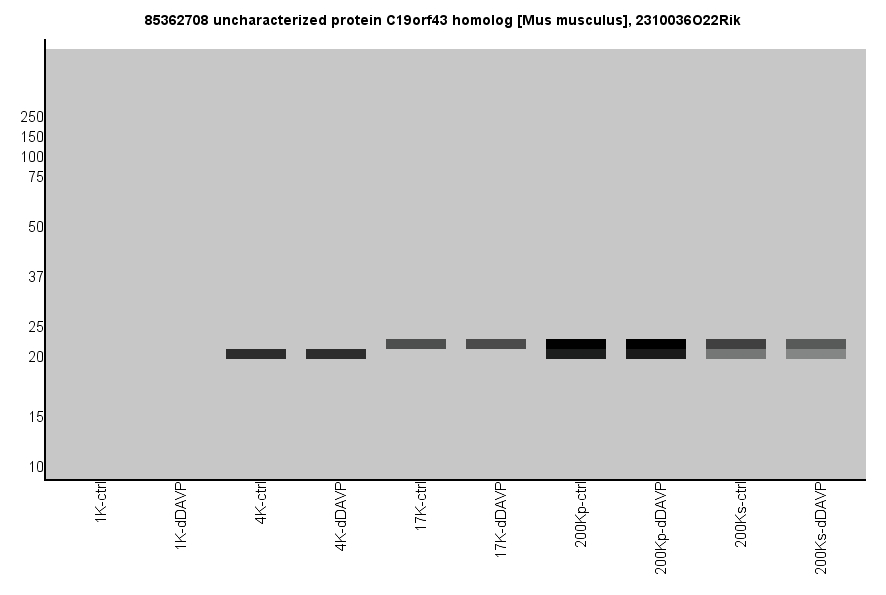 | 85362708 | 2310036O22Rik | 18245 | 1.08 | 1.08 | 1.14 | 1.14 | 1.14 | 1.14 | 1.14 | 1.14 | uncharacterized protein C19orf43 homolog | |||||||||