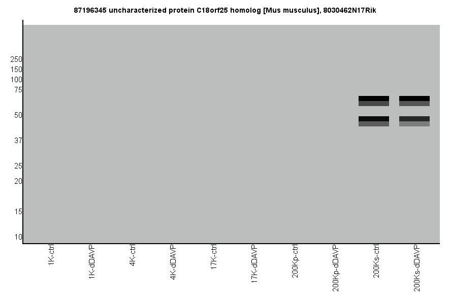 | 87196345 | 8030462N17Rik | 42650 | 1.52 | 1.52 | uncharacterized protein C18orf25 homolog | |||||||||||||||